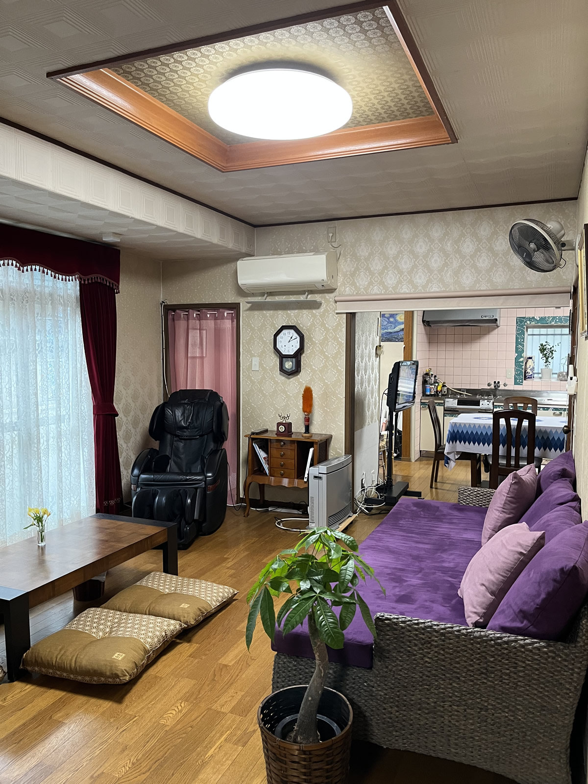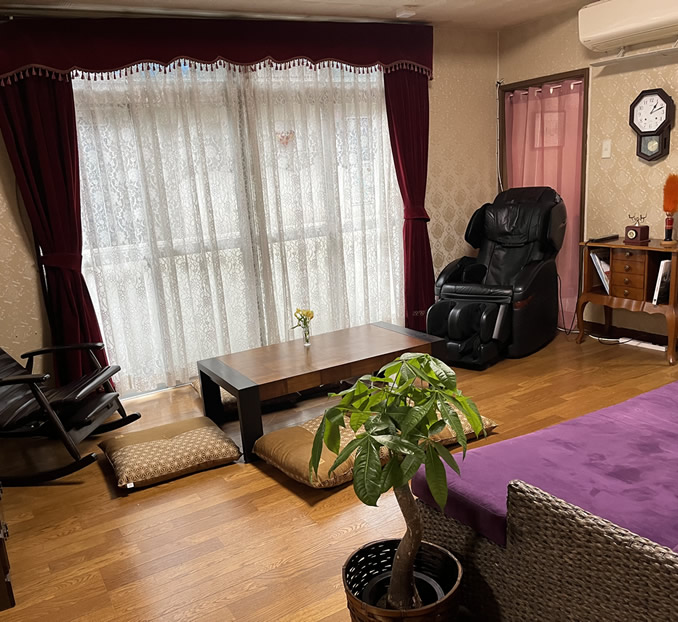 10畳の広々したリビング。昭和レトロな小物をたくさん置いています。