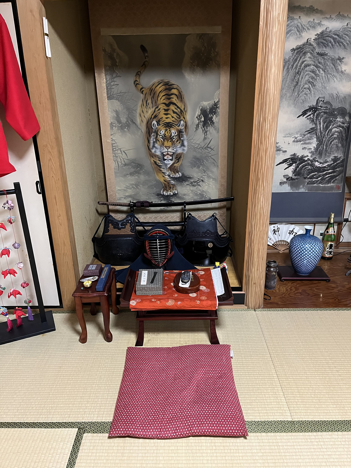 A huge tiger hanging scroll greets you. Kendo swords and waistcoats are displayed.